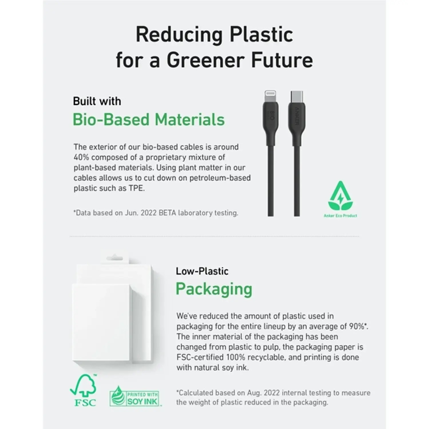 The exterior of bio-based cables is around 40% composed of a proprietary mixture of plant-based materials | Plants like Corn & Sugar Cane | Low-Plastic Packaging - average of 90% | 20,000-bend lifespan, Ready to handle the stresses & strains of daily use | MFi certified for flawless compatibility with all Lightning devices | Supports up to 30W charging, enough to power your iPhone or iPad at high speed