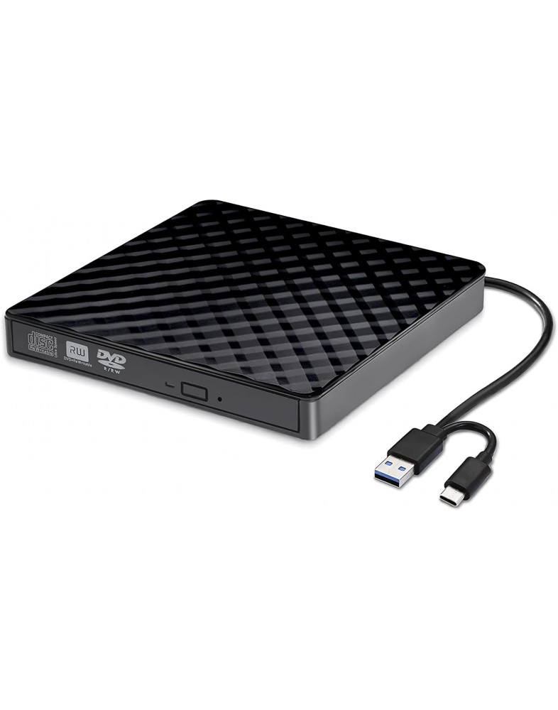 - 【Ultra-Slim Design】 - The External cd player have stylish ultra-slim design checkered textured case provides tactile and visual enjoyment. The push rest can be pushed into the disc with a single button. The lightweight body allows you to keep this external CD drive in your travel bag or on your desk at all times. Plus, the recessed cable design lets you never have to worry about losing your cable.
